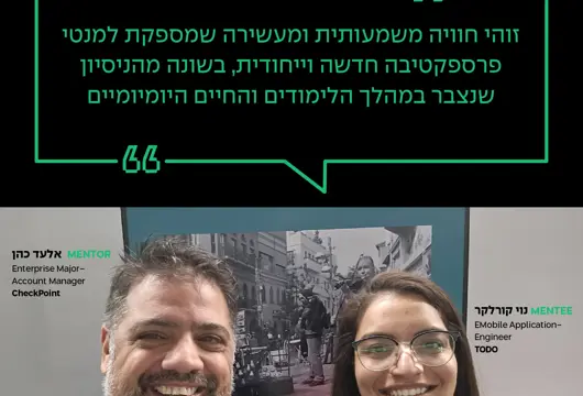 "למדתי להקשיב יותר טוב, למדתי לשאול במקום לענות," משתף אחד המנטורים, "פיתחתי את הסבלנות שלי עוד שלב ובעיקר למדתי להיות שם בשביל האחר 100% לראשונה בחיי."