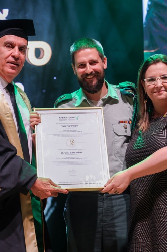 The "Honorary Alumnus" award was presented to Lt. Col. Barr Inbar, Head of BASMACH, in recognition of his service as a visionary leader who combines exceptional professionalism with an inspiring educational, moral and social mission, and for spearheading programs whose graduates make pivotal contributions to national security, while providing opportunities to young Israelis from the social and geographic periphery.